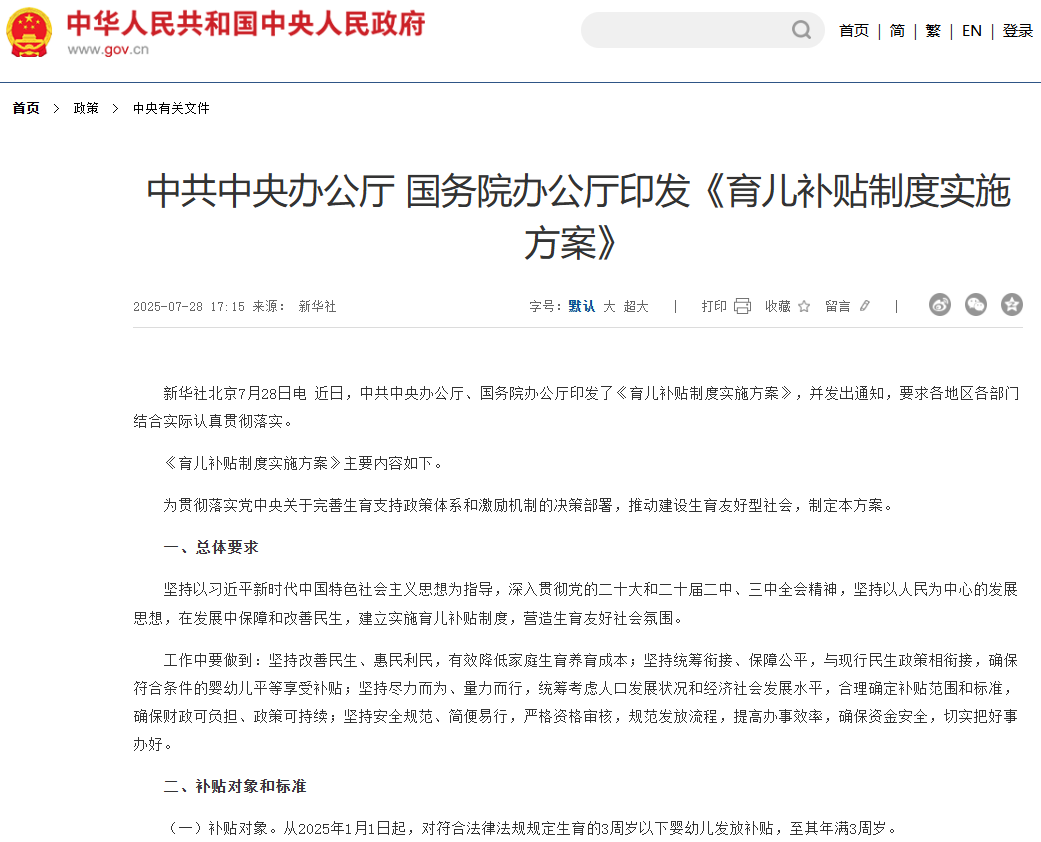 【環球網消費綜合報道】2025年7月30日,國務院新聞辦公室新聞發佈會,為中國家庭送來了一份沉甸甸的“大禮”。中共中央辦公廳、國務院辦公廳聯合印發的《育兒補貼制度實施方案》正式對外公佈,標誌着一項具有里程碑意義的民生政策正式啓航。方案明確,從2025年1月1日起,無論一孩、二孩還是三孩,每個家庭每年均可領取3600元補貼,直至孩子年滿3週歲。這一政策是新中國成立以來首次大範圍、普惠式、直接性向羣眾發放的民生保障現金補貼。