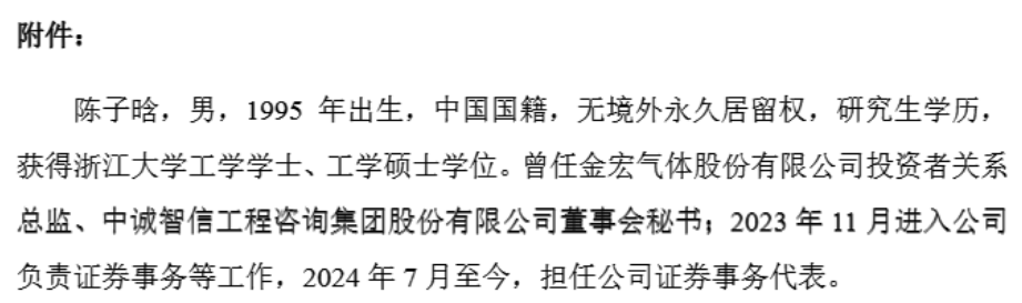 但據上市公司四方光電(688665.SH)在今年1月份發佈了《關於變更公司董事會秘書、財務負責人的公告》,披露新聘人陳子晗為公司董秘,同時披露其曾任金宏氣體股份有限公司投資者關係總監、中誠智信工程諮詢集團股份有限公司董事會秘書,後於2023年11月進入公司負責證券事務等工作。