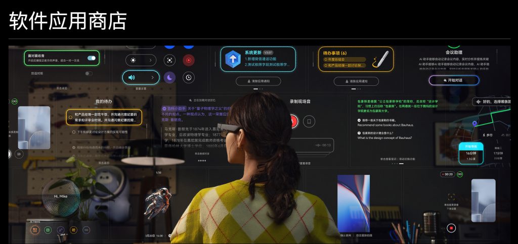 “電腦和手機等產品,虛擬世界與現實世界是分離的”,他表示,“比如手機導航指示你目的地就在前方大樓,但當你面對三棟未標識的大樓時,你無法確定哪一棟樓才是目的地。其次是AI的應用,眼鏡是AI最好的載體,因為它能看你所看,聽你所聽,並把這些數據和信息傳輸給AI系統,通過多模態大模型進行處理,與你進行自然的交互。眼鏡可以幫助我們實現虛實融合,創造一個不一樣的、升級的、更加豐富的場景生態。”