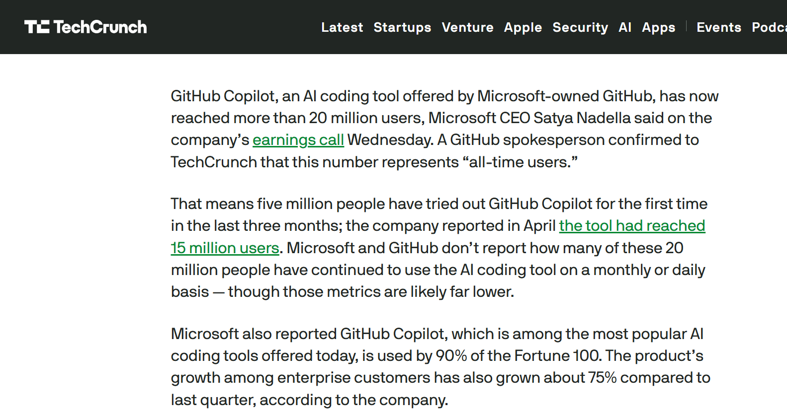 【環球網科技綜合報道】7月31日消息,微軟CEO薩蒂亞·納德拉近日在公司財報電話會議上披露,旗下GitHub推出的AI編程工具GitHub Copilot用户總數已突破2000萬。數據顯示,過去三個月內,有500萬用户首次嘗試使用GitHub Copilot。今年4月,該工具用户數已達1500萬,用户規模保持穩步增長態勢。