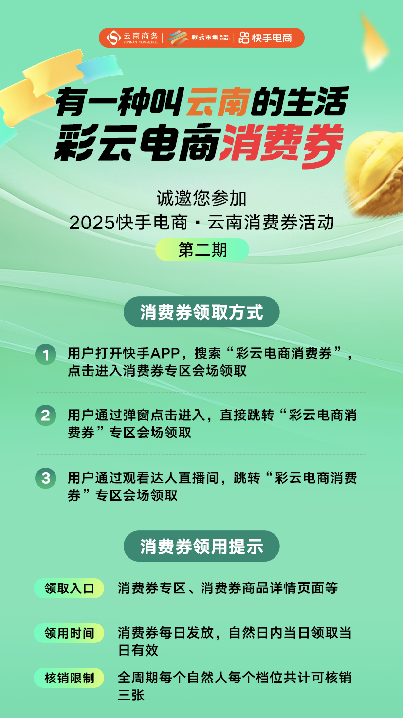 用户登錄快手APP,搜索“彩雲電商消費券”或“雲南消費券”,或通過彈窗、達人直播間跳轉活動專區,即可領取消費券,至高享滿300減50優惠。消費券每日發放,當日領取當日有效,全週期內每個自然人每個檔位可核銷三張。