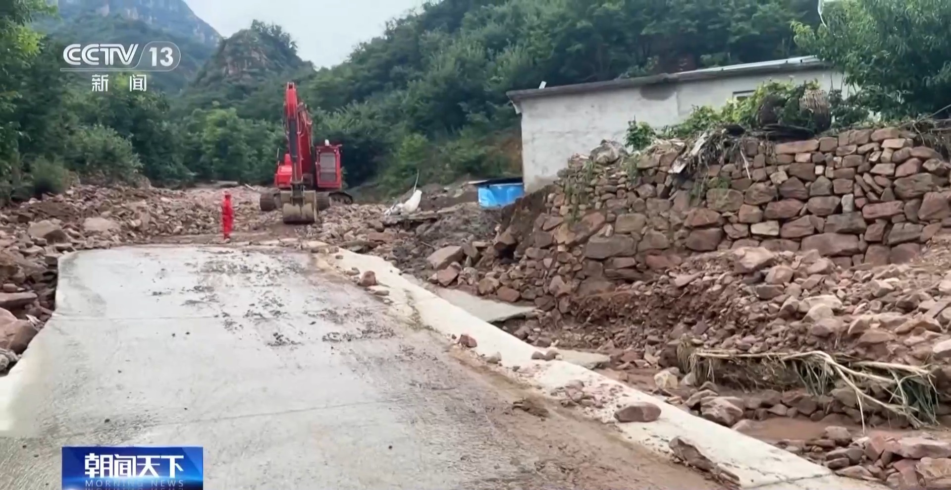 *中國安能一局承德救援現場指揮部指揮長 劉建坤:*這條道路是楊家台村唯一的出村的小通道,是主幹道也是生命線。這條道路的搶通可以方便地方政府為裏面的村民運送生活物資,同時也有利於地方政府快速恢復通信通電。