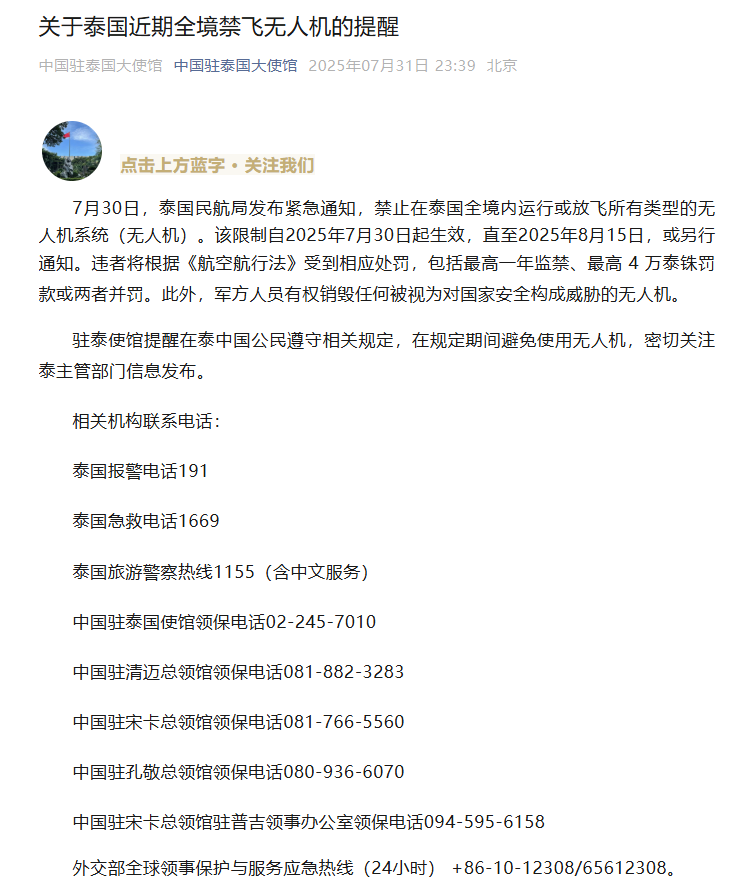 7月30日,泰國民航局發佈緊急通知,禁止在泰國全境內運行或放飛所有類型的無人機系統(無人機)。該限制自2025年7月30日起生效,直至2025年8月15日,或另行通知。違者將根據《航空航行法》受到相應處罰,包括最高一年監禁、最高 4 萬泰銖罰款或兩者並罰。此外,軍方人員有權銷燬任何被視為對國家安全構成威脅的無人機。