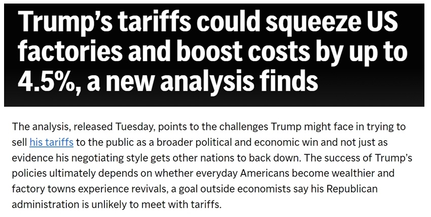 美國華盛頓公平增長中心進行的一項最新研究發現,特朗普政府的關税可能會衝擊美國製造業,使美國工廠成本最高增加4.5%。從長期看,關税最終或將拖累美國的經濟效率。