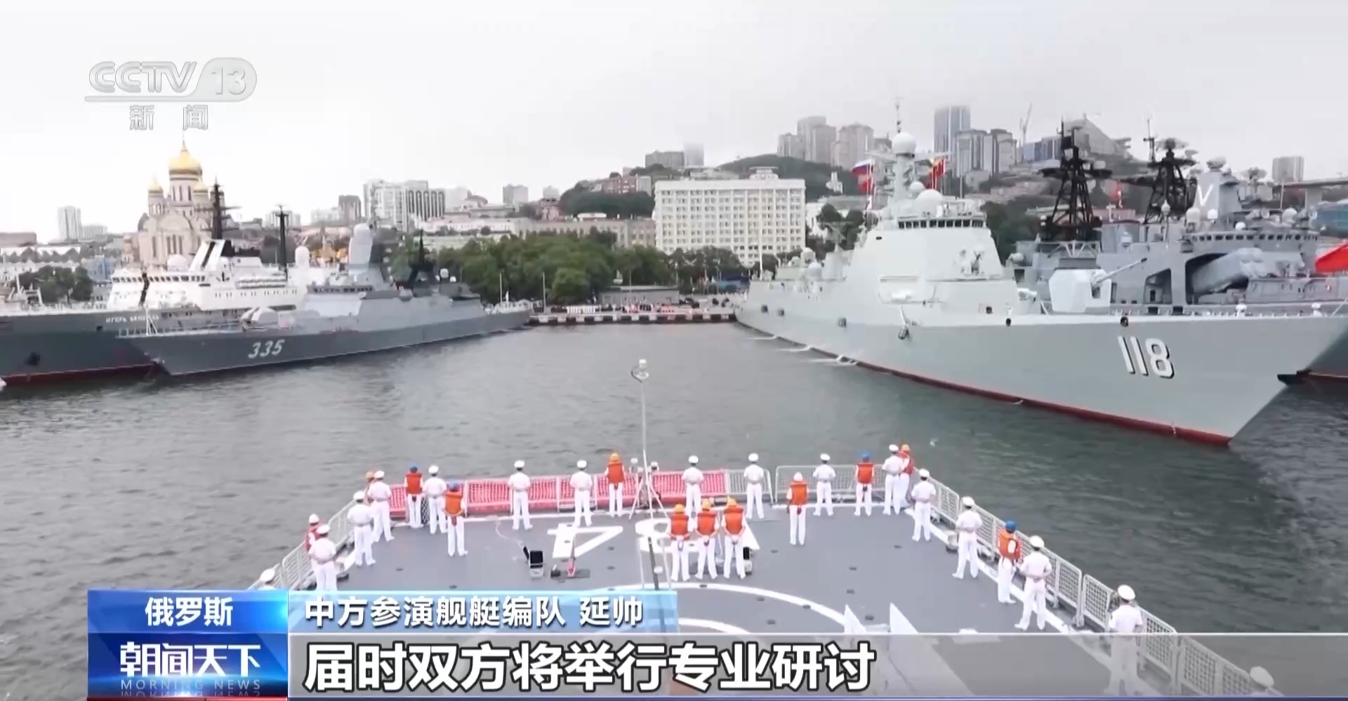 在俄羅斯符拉迪沃斯托克某軍港碼頭,懸掛中俄兩國國旗的中國海軍艦艇編隊緩緩抵靠。中俄雙方聯合導演部成員、中國駐俄大使館武官處、當地總領事館工作人員等到碼頭迎接。俄方總導演表示,中國海軍在世界反法西斯戰爭勝利80週年之際抵達符拉迪沃斯托克,給這次聯演賦予了特殊的意義。希望雙方繼續深化聯合行動和友好互訪,共同維護亞太地區海洋的寧靜和安全。