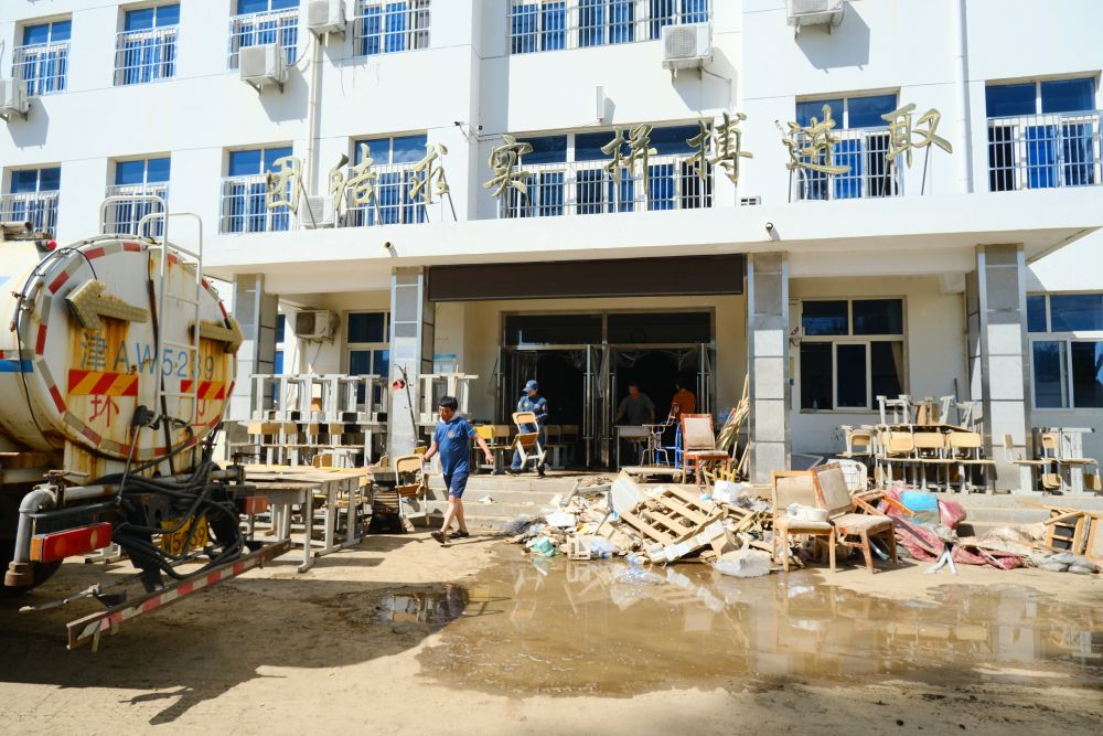 7月31日清晨,課桌上的泥土正在操場上被沖刷乾淨,食堂地面厚厚的淤泥也被徹底清理。剛剛經歷過一場洪水的天津市薊州區下營中學,正在一點點恢復生機。