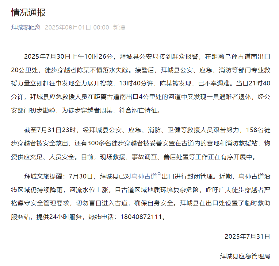 2025年7月30日上午10時26分,拜城縣公安局接到羣眾報警,在距離烏孫古道南出口20公里處,徒步穿越者陳某不慎落水失蹤。接警後,拜城縣公安、應急、消防等部門專業救援力量立即趕往事發地全力展開搜救,13時40分許,陳某被發現,已不幸遇難。當日21時40分許,拜城縣應急救援人員在距離古道南出口4公里處的河道中又發現一具遇難者遺體,經公安部門初步勘驗,為徒步穿越者周某,符合溺亡特徵。