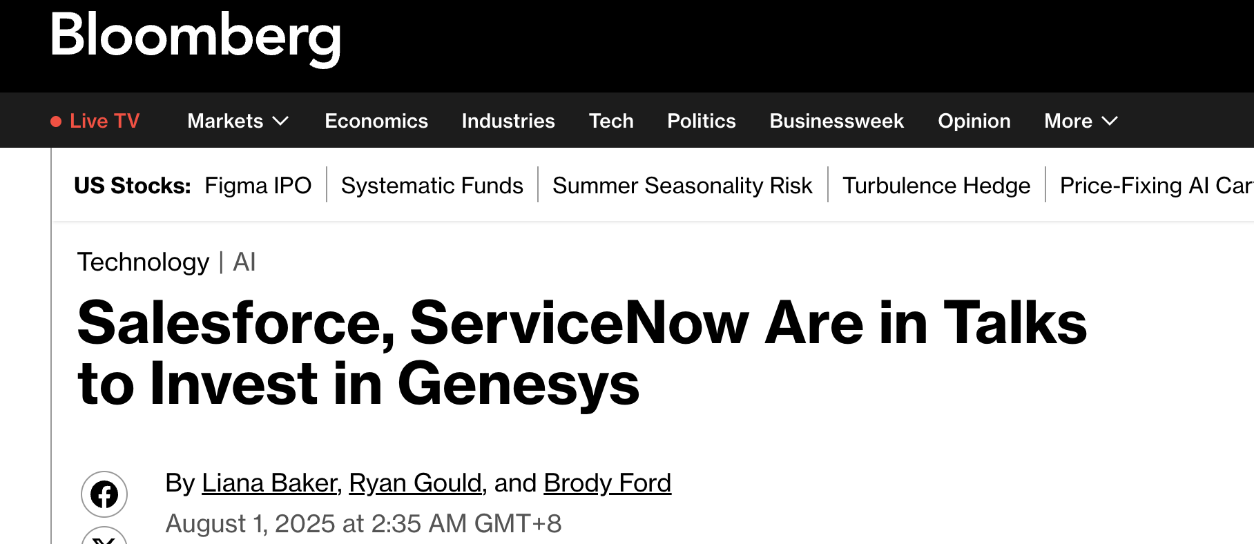 【環球網科技綜合報道】8月1日消息,據外媒報道,知情人士透露,全球企業軟件巨頭Salesforce與ServiceNow正就向客户體驗雲服務商Genesys Cloud Services Inc.(以下簡稱“Genesys”)各投資約7.5億美元展開深入談判。若交易達成,Genesys的投後估值將達150億美元,而兩大競爭對手罕見聯手投資同一家公司的舉動,或標誌着雲服務行業從“零和博弈”轉向“生態共建”的新階段。據消息人士稱,該交易最早可能於當地時間週四正式公佈。