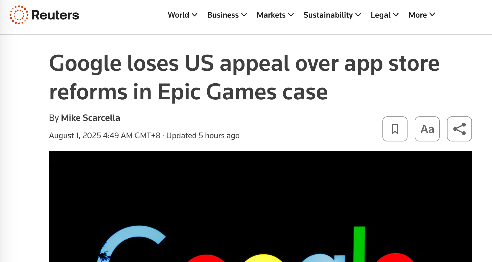 【環球網科技綜合報道】8月1日消息,據外媒報道,美國聯邦第九巡迴上訴法院當日駁回谷歌對Epic Games反壟斷訴訟的上訴請求,維持地方法院此前禁制令。這意味着谷歌需在規定期限內全面改革Google Play應用商店運營政策,包括允許用户直接下載第三方應用商店、開放應用目錄訪問權限等關鍵措施。