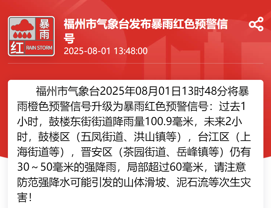過去1小時,鼓樓東街街道降雨量100.9毫米,未來2小時,鼓樓區(五鳳街道、洪山鎮等),台江區(上海街道等),晉安區(茶園街道、嶽峯鎮等)仍有30~50毫米的強降雨,局部超過60毫米,請注意防範強降水可能引發的山體滑坡、泥石流等次生災害!