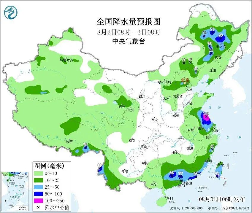 預計,8月1日8時至2日8時,安徽中南部和東部、江蘇大部、山東南部和東部沿海、遼東半島東南部、台灣島中南部等地有大到暴雨,其中,安徽南部、江蘇中部和西南部、台灣島南部等地的部分地區有大暴雨(100~230毫米);此外,內蒙古東北部和河套地區、陝西東北部、雲南西北部、廣西南部、廣東東部和西南部、福建東部、浙江東南部等地的部分地區有大到暴雨。上述部分地區伴有短時強降水(最大小時降雨量20~50毫米,局地可超過70毫米),局地有雷暴大風等強對流天氣。中央氣象台8月1日6時繼續發佈暴雨黃色預警。