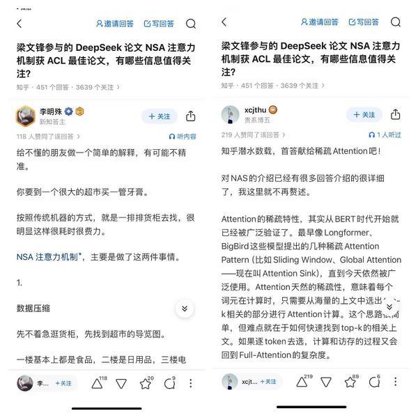 知乎上圍繞稀疏注意力的專業討論早有積累,且極具行業前瞻性。2024年,清華大學計算機系副教授、知乎答主劉知遠團隊發佈大模型長文本理解方法InfLLM,其中涉及的NSA改進方案被DeepSeek此次論文引用。InfLLM項目參與者、知乎答主xcjthu也深度參與NSA討論,並表示,“正如Deepseek-V3帶給大家的震撼一樣,我認為NSA的硬件親和性是這篇論文最精彩的部分”。