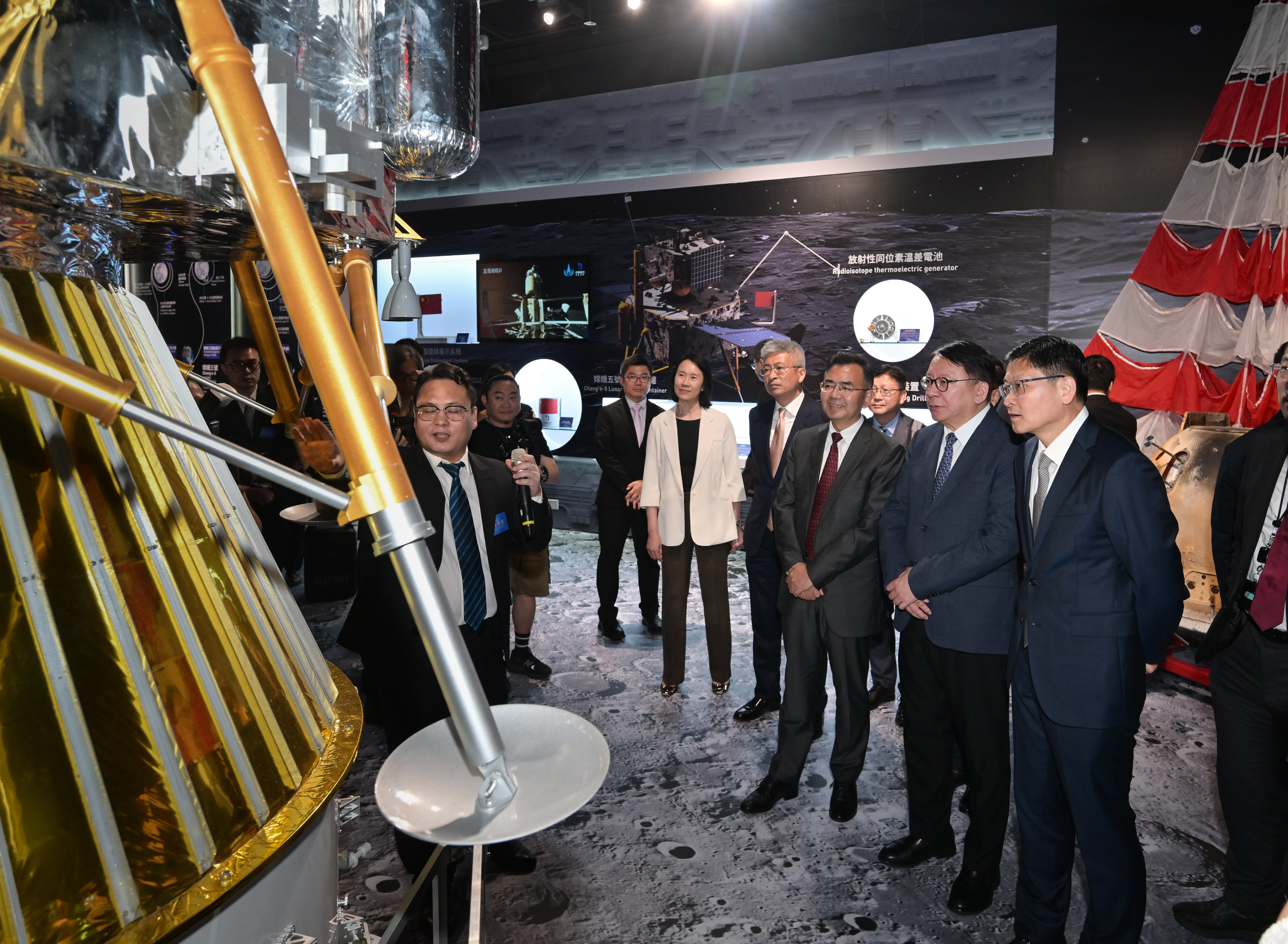 陳國基表示,本次展覽展出了探月工程的最新成果以及中國在“三航”領域取得的卓越成就,不僅系統地呈現國家的科技創新實力,彰顯中國在全球科技格局中的重要地位,更能強化國民科技自信,為香港市民提供一個不可多得的愛國主義教育機會。香港積極融入國家發展大局,為國家作出貢獻,香港的科學家也參與到重大科研任務中,以國際視野推動國家發展。本次展覽對介紹國家科技發展成就提供極具價值的參考,展現了香港作為連接國家與世界的文化樞紐的角色,向世界講好中國故事,向公眾弘揚愛國主義精神。