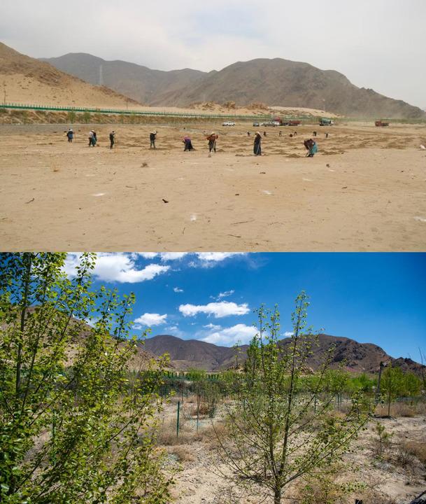 這是一張拼版照片。上圖為西藏山南市貢嘎縣境內拍攝的“先造後補工程”(2021年攝);下圖為西藏山南市貢嘎縣境內拍攝的拉薩南北山造林綠化(貢嘎段)(2025年4月24日攝)。新華網 旦增努布 攝