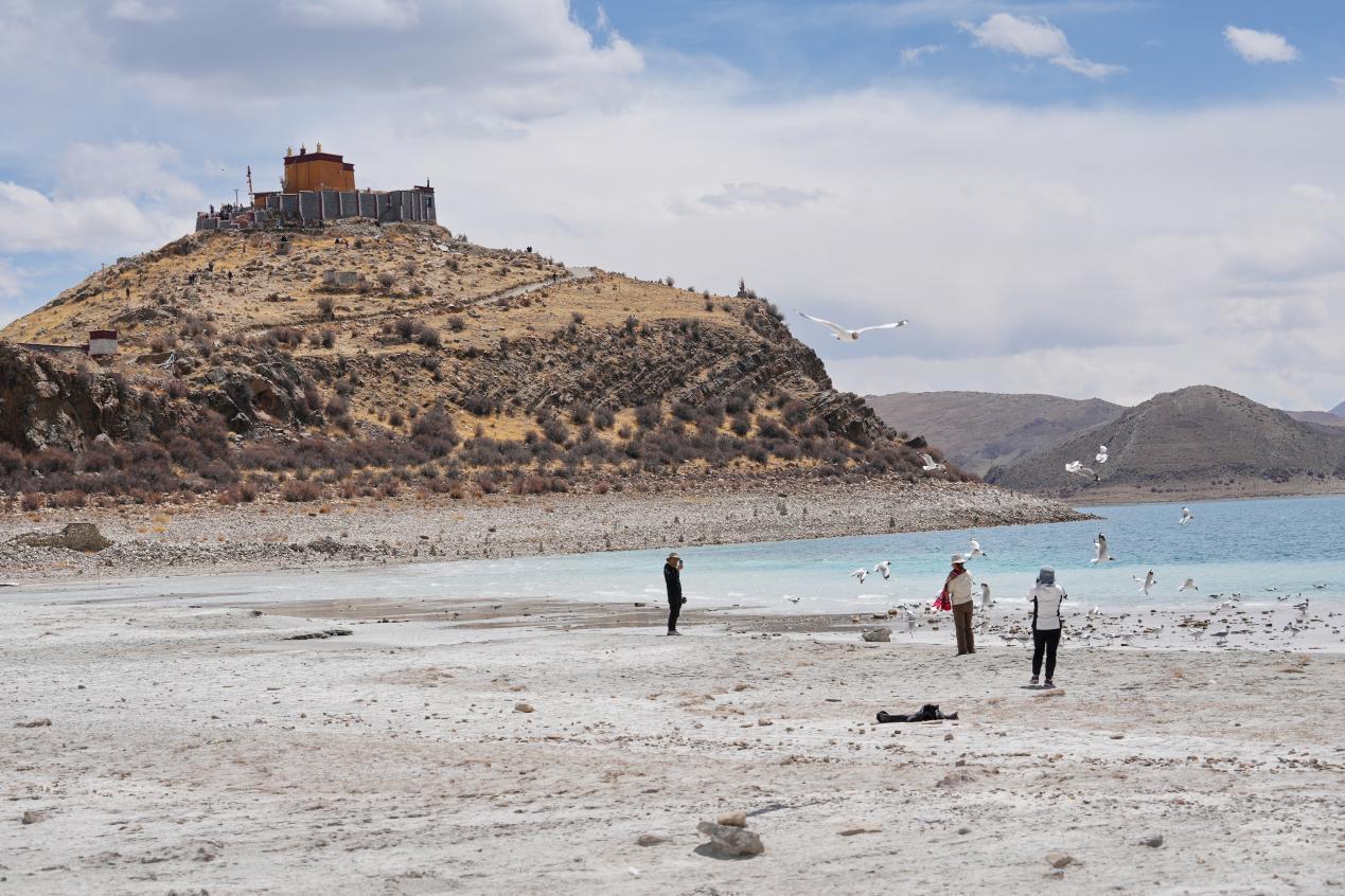 遊客在羊卓雍錯北岸的日託寺附近投餵棕頭鷗(2024年4月5日攝)。新華社記者 張汝鋒 攝