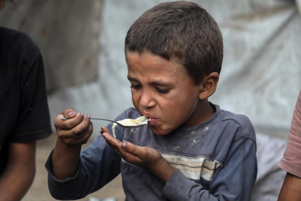 7月29日,在加沙城的一個帳篷裏,一名男孩在進食。新華社發(裏澤克·阿卜杜勒賈瓦德攝)