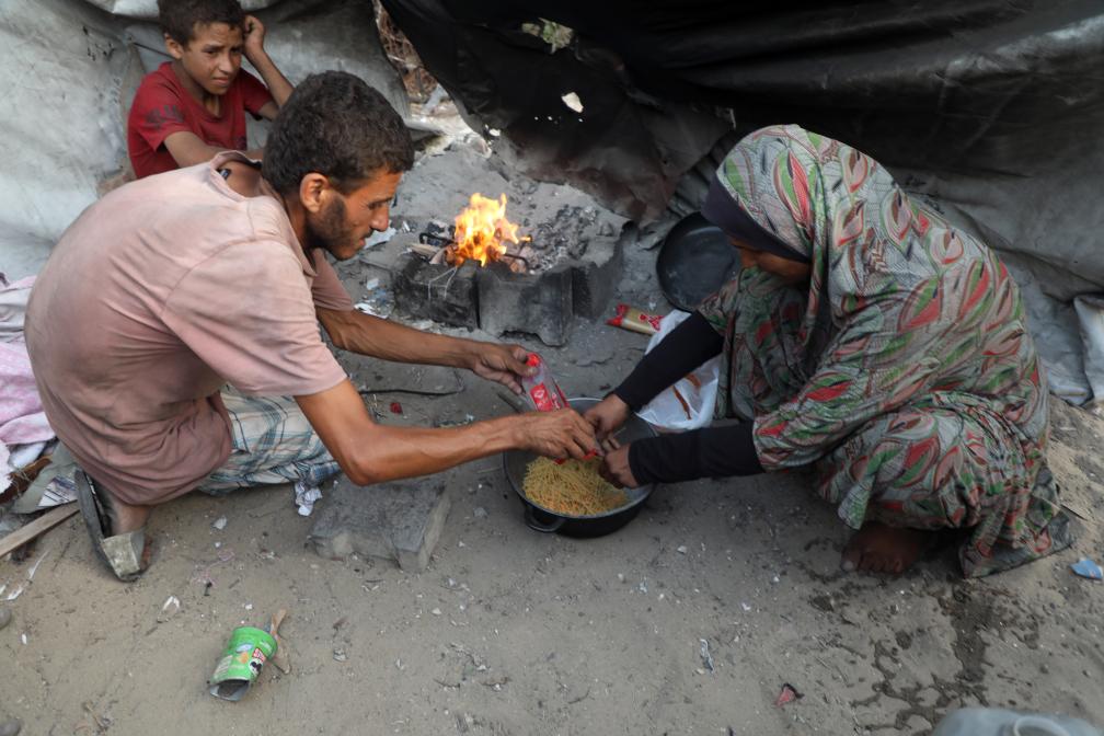 7月29日,在加沙城,一名男子和他的家人在帳篷裏做飯。新華社發(裏澤克·阿卜杜勒賈瓦德攝)