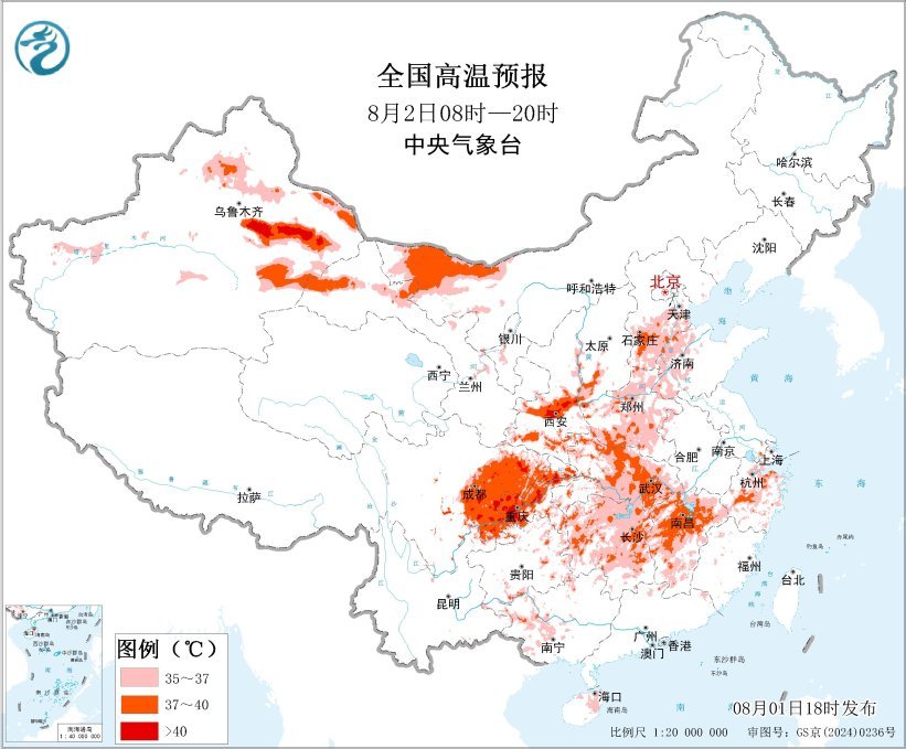 預計8月2日白天,華北南部、陝西中南部、黃淮中西部、江漢、四川盆地、江南大部、華南西部以及新疆北部和南疆盆地東部、甘肅西部、內蒙古西部等地的部分地區有35-39℃的高温天氣,其中,新疆吐魯番盆地、陝西關中平原、四川東部、重慶等地局地可達40℃及以上。