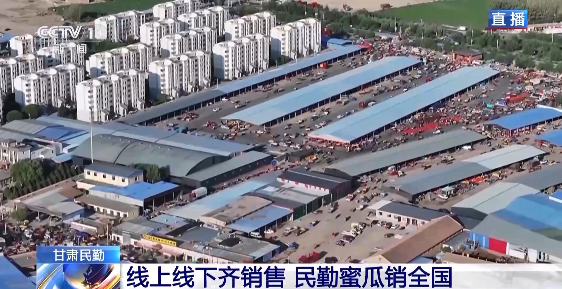 *總枱記者 馬麗:*這段時間,每天有近千輛貨車在市場交易,單日銷售蜜瓜可達3000噸。在高峯期,每天有15000人在市場忙碌,從銷售、包裝、運輸,形成了完整的產業鏈,藉助蜜瓜產業,收成鎮也建成了統一良種、統一管護、統一檢測的規模化種植基地,保證了民勤蜜瓜的品質。