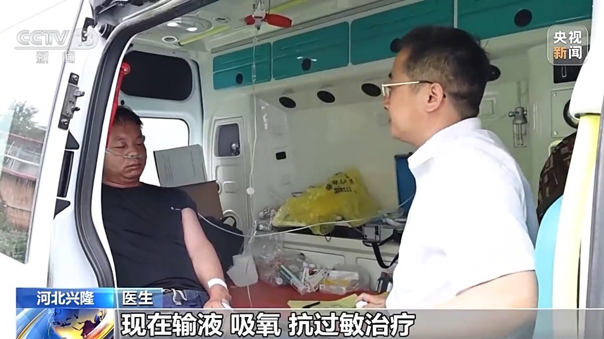*醫生:*指揮部接到通知後,就趕緊派人過來。通過對症用藥搶救,現在輸液、吸氧、抗過敏治療,現在患者逐漸好轉。