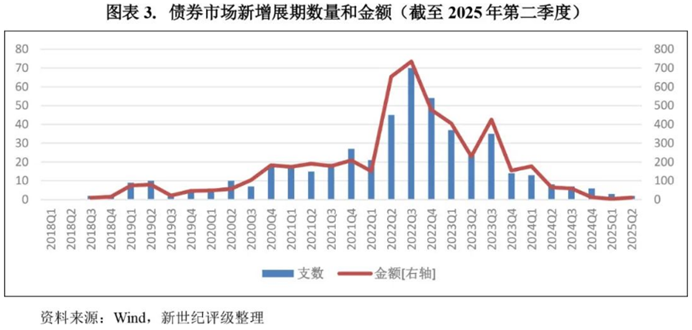另據公開報道,2025年第二季度,國內債券市場信用風險狀況繼續保持緩和狀況,新增違約及展期金額達到歷史低點。新世紀評級分析認為,第二季度房地產風險暴露已基本接近尾聲,房地產市場繼續向止跌回穩方向邁進,降息等刺激政策推動居民購房意願和貸款意願邊際改善,多家出險房企推出債務重組方案;第二季度城投企業融資管控力度繼續保持嚴格態勢,隱性債務化解工作步入常態化,城投企業非標風險事件和商票逾期等信用風險事件發生頻次同比繼續降低。