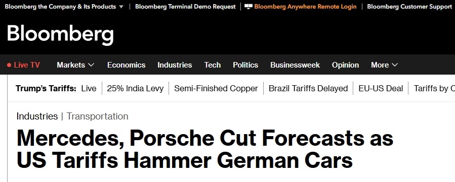 歐洲豪華車陣營同樣遭受重創。彭博社報道顯示,受美國新關税政策及全球需求影響,梅賽德斯-奔馳與保時捷雙雙下調年度利潤預期。梅賽德斯預計汽車業務利潤率將從至少6%降至4%以下,其高端化戰略正被貿易壁壘削弱;保時捷則因無美國生產基地,在關税疊加品牌戰略調整成本(約13億歐元)的雙重壓力下,銷售回報率可能滑落至5%(原目標6.5%)。