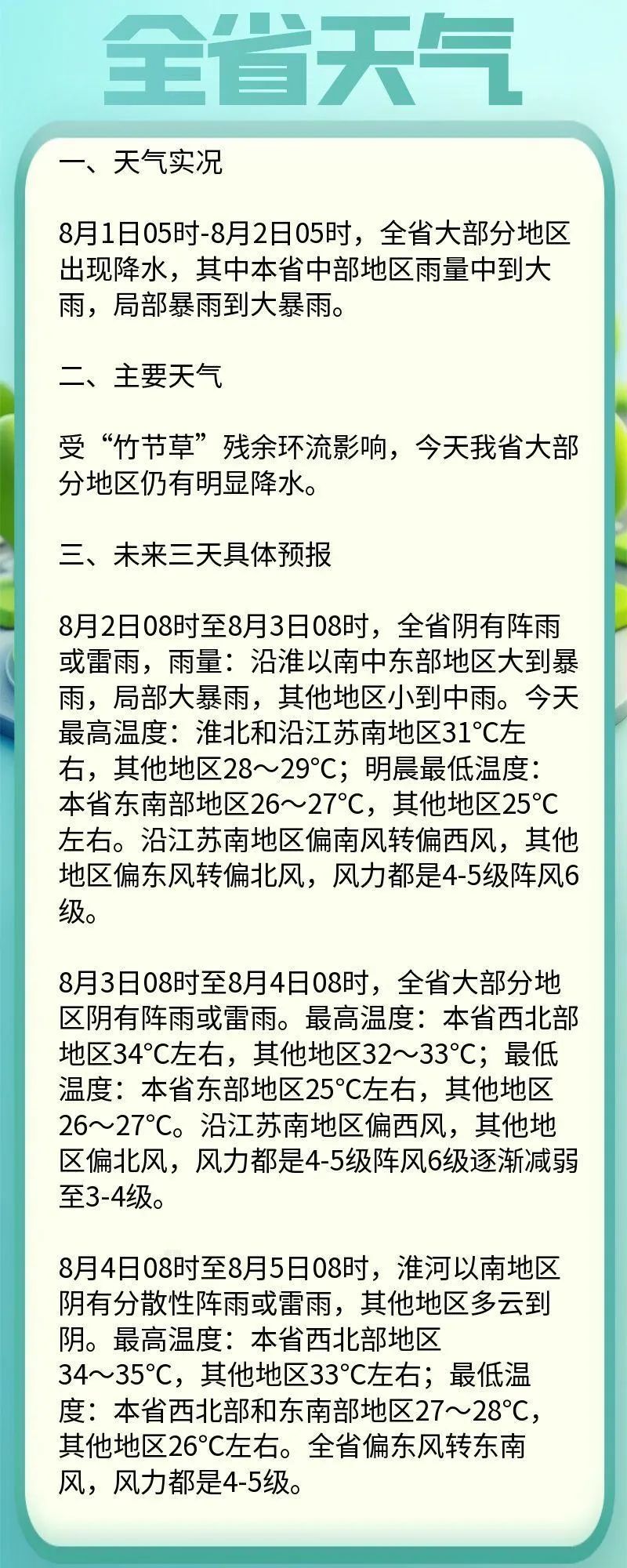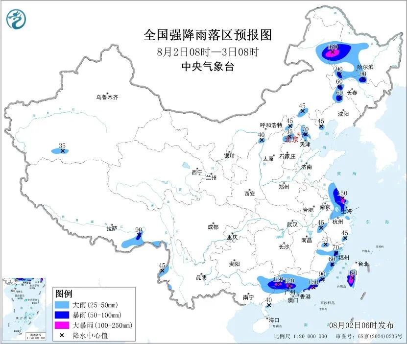 預計,8月2日08時至3日08時,內蒙古中東部、黑龍江中西部、吉林西部、遼寧北部和西南部、山西北部、河北中北部、北京東北部和西南部、天津中北部、江蘇中南部和東部、上海中西部、浙江北部和東南部、安徽南部、江西東北部、福建北部和東部、廣東中北部和東部、廣西東部、雲南西部、台灣島等地的部分地區有大到暴雨,其中,內蒙古東北部、黑龍江西部、江蘇東南部、廣東中北部和東南部沿海、台灣島中南部等地局地有大暴雨(100~150毫米)。