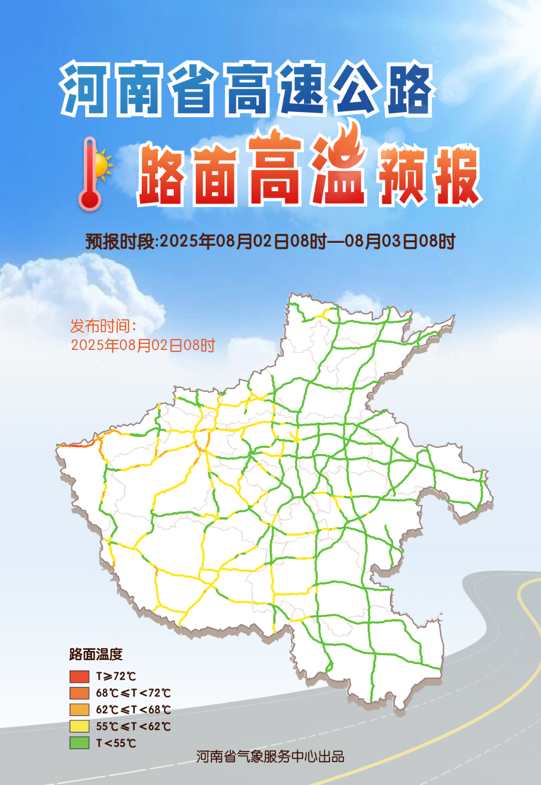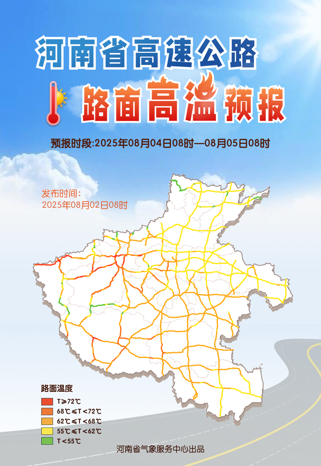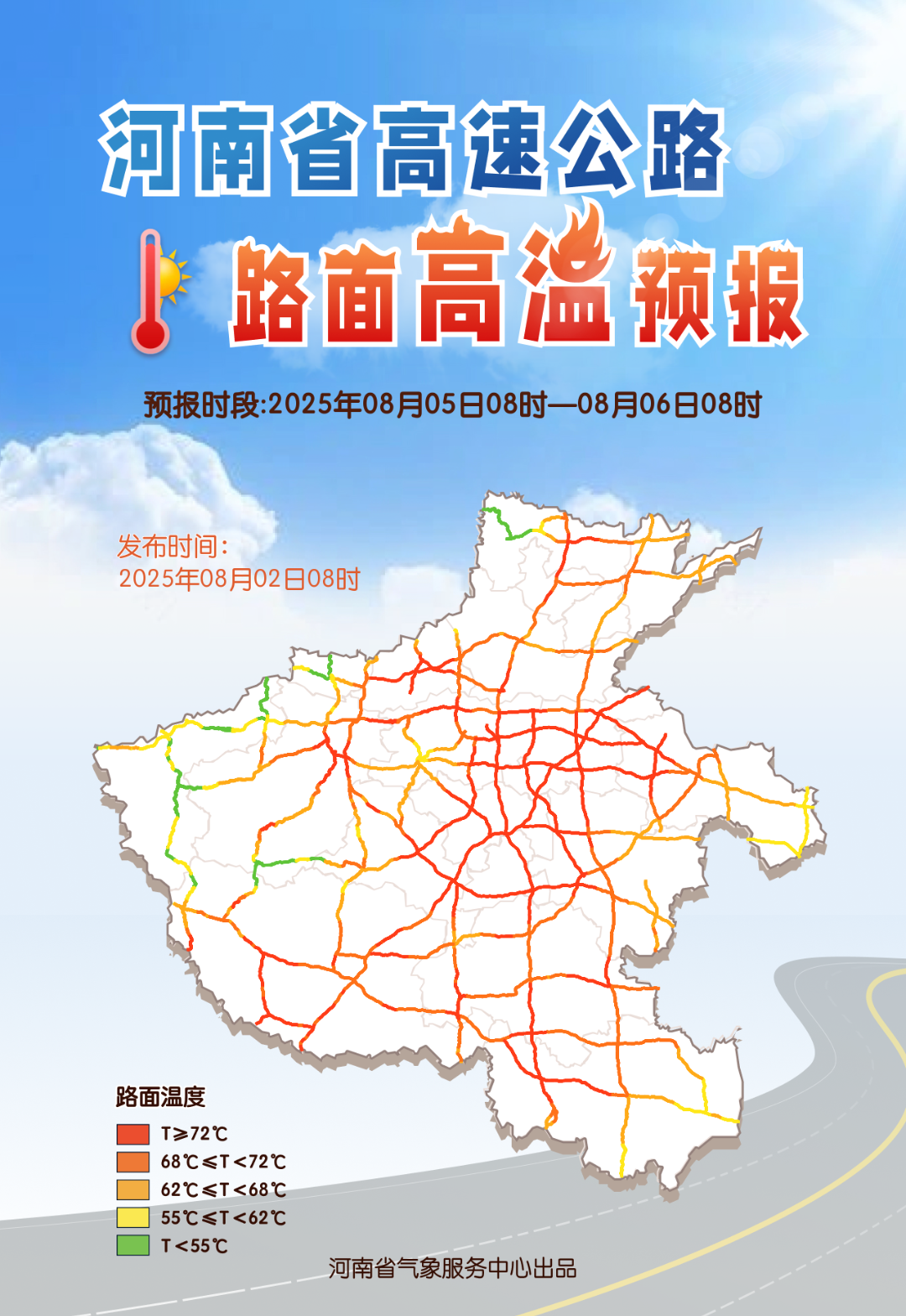 與此同時,由於陽光直射,路面接收到更多太陽輻射,温度更高,5日全省多處路段路面温度超過72度,提醒大家車內不要放打火機、香水等易燃易爆物品,駕車出行注意提前檢查車輛狀態。