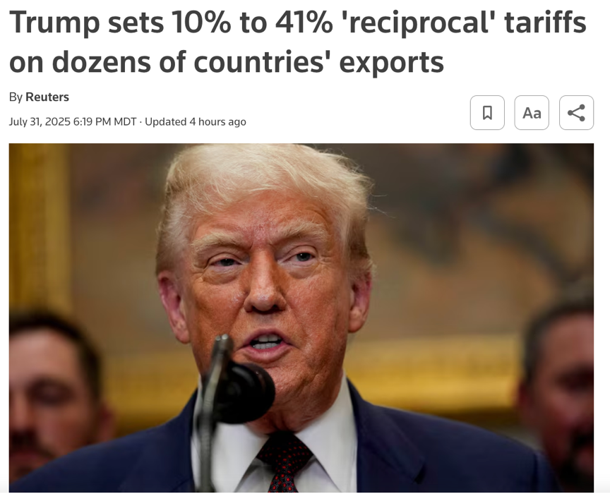 當地時間7月31日,美國總統特朗普簽署行政令,擬對尚未與美方達成協議的國家或地區(包括加拿大、巴西等)徵收10%至41%不等的對等關税,並明確所有關税將自2025年8月7日正式生效,而非此前宣佈的8月1日“最後期限”。