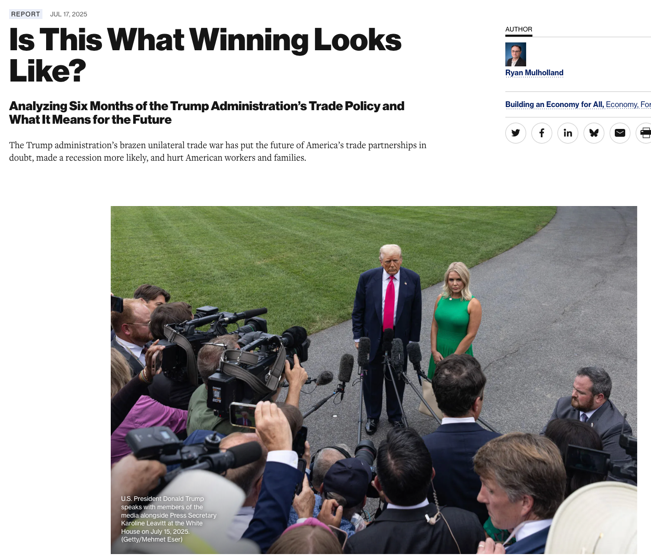 △美國進步中心(Center For American Progress)在其官網發表評論,質疑特朗普政府關税協議的戰略價值,認為其不能有效改善國家安全或經濟結構。