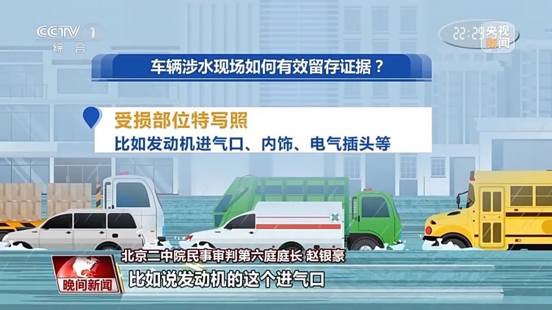 北京二中院民事審判第六庭庭長 趙銀豪: 最好把車的全景照拍下來,車、車牌還有周邊的參照物;把水位線照出來,能夠清晰地顯示水位是到達了車輪還是到座椅,還是儀表盤都已經淹沒了。還有,受損部位的特寫,比如發動機的進氣口,車內的裝置以及電器插頭等一些特寫部位。