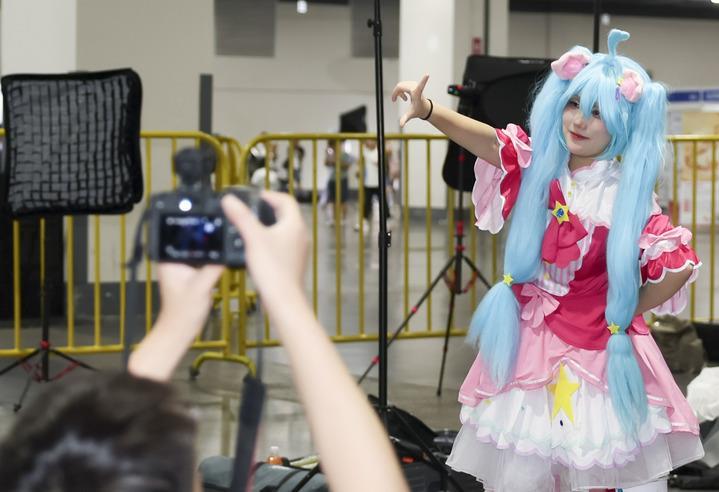 在上海舉行的2025年中國國際動漫遊戲博覽會上,扮裝者在攝影區拍照(7月4日攝)。新華社記者 王翔 攝