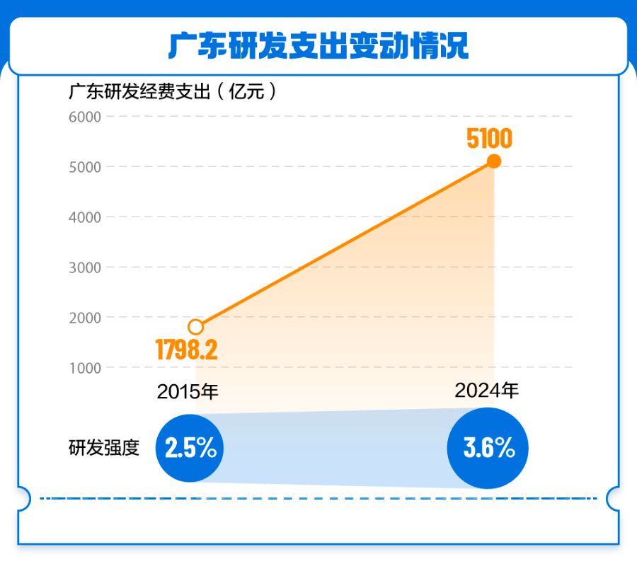 科技是第一生產力。面對新週期和新趨勢,廣東“重倉”科技創新激活發展動力,2024年全省研究與試驗發展(R&D)經費支出約5100億元,是2015年的2.8倍;研發投入強度為3.6%左右,已經超過日本、德國等製造強國的水平。