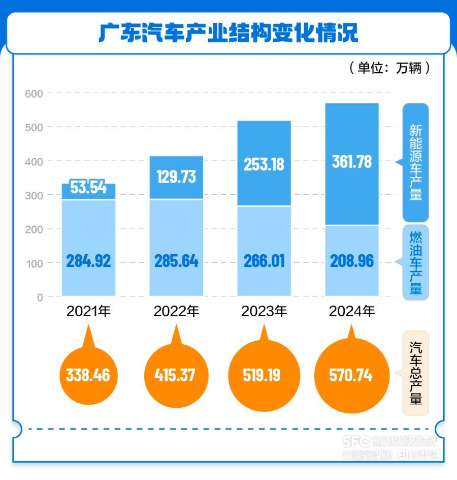 從上世紀80年代依靠合資起家,經歷燃油車向新能源汽車轉型,過去6年多里廣東汽車產業成功實現了新舊動能銜接。據行業協會統計,2024年廣東汽車總產量570萬輛,比2019年增加258.5萬輛,其中燃油車產量持續下滑,新能源汽車產量則從2019年的21.6萬輛激增至去年的361.78萬輛。五年十倍速的增長,打破了新技術革命中舊產業的老大企業、老大區域不易轉身的路徑鎖定。