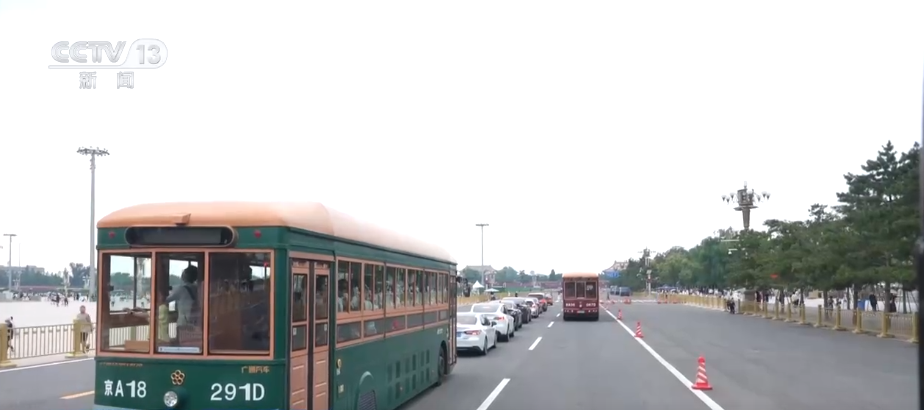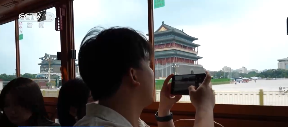 在北京前門地區,記者身後可以説是暑期最熱的公交線路之一——大美中軸觀光線,它車身仿古,參照了百年前北京的第一輛有軌電車,當師傅踩下制動板,連接的銅鈴鐺就會鐺鐺地響個不停,提醒行人躲避,因此它也得名鐺鐺車。