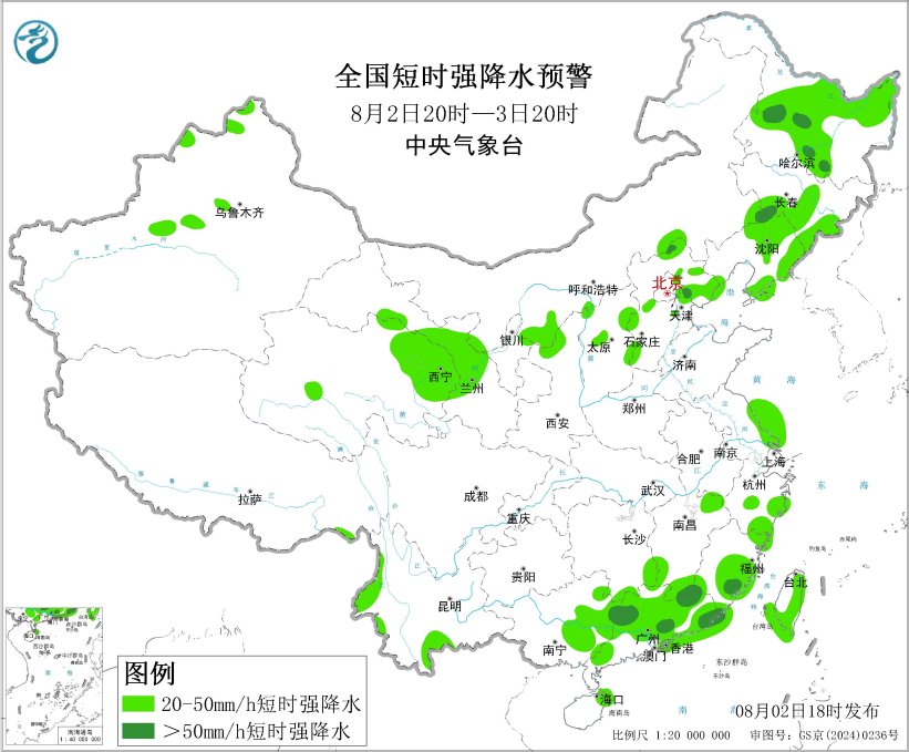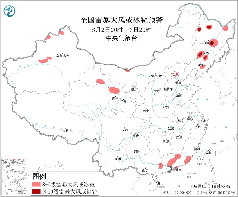 預計8月2日20時至3日20時,西北地區中部、東北地區及華南東部等地的部分地區將有8級以上雷暴大風或冰雹天氣,其中,黑龍江西部和南部、吉林南部、遼寧北部等地的部分地區將有10級以上雷暴大風,最大風力可達11級以上;西北地區中部和東北部、東北地區、華北、江南中東部、華南等地的部分地區將有小時雨量大於20毫米的短時強降水天氣,其中,內蒙古東南部、黑龍江西部和南部、遼寧西北部、河北東北部、天津北部、江西南部、福建東南部、廣西東部、廣東中東部等地的部分地區小時雨量大於50毫米,最大可達80毫米以上。