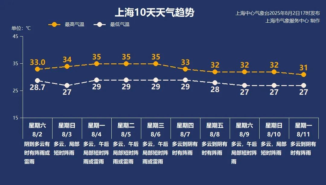 明天上海降水明顯減小,轉為多雲為主的天氣,偶爾雲層中灑些陣雨。早間最低氣温在27℃左右,吹4~5級西南風,有利於氣温上升,預計最高氣温可上升到34℃。空氣潮濕,相對濕度95%-60%,體感悶熱,需注意防暑降温。