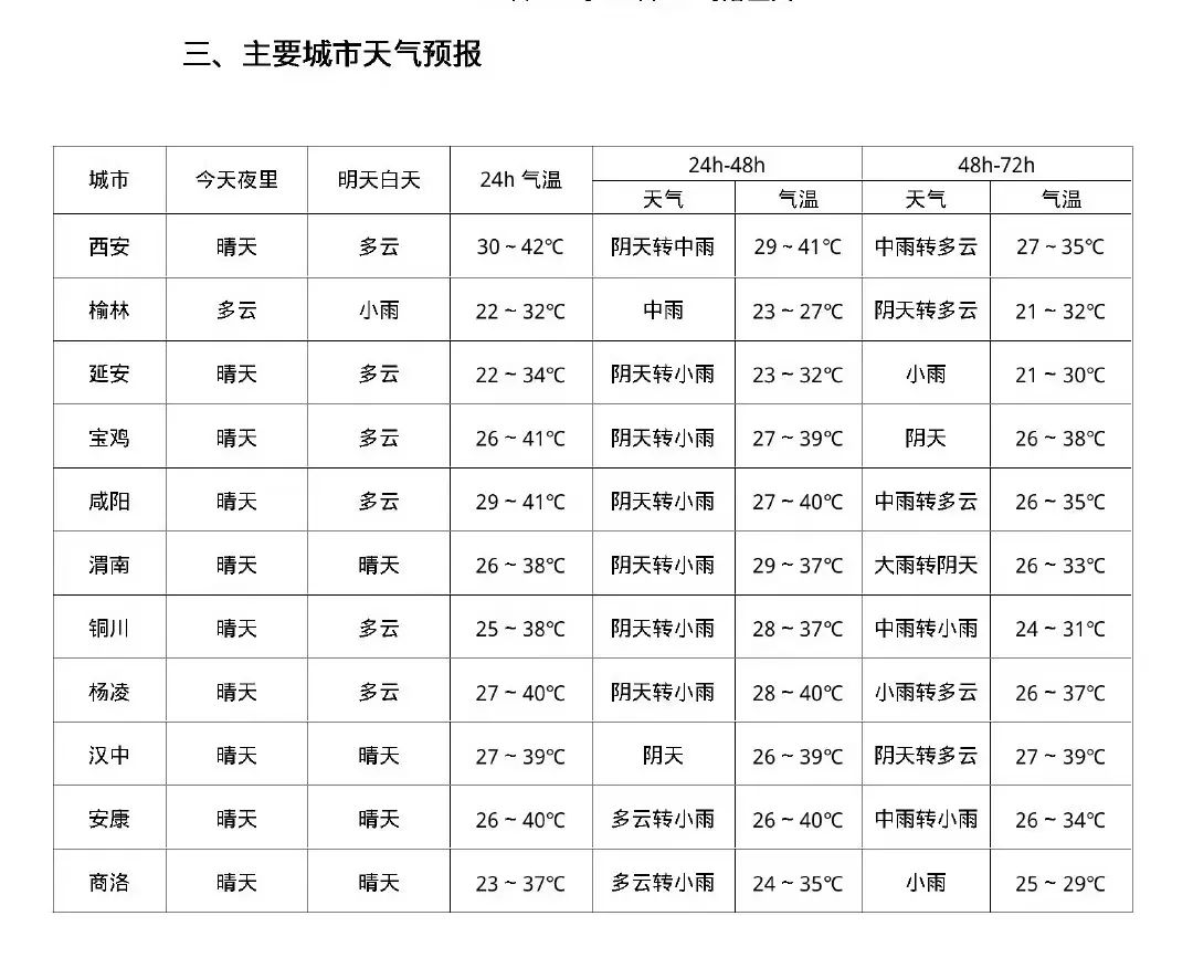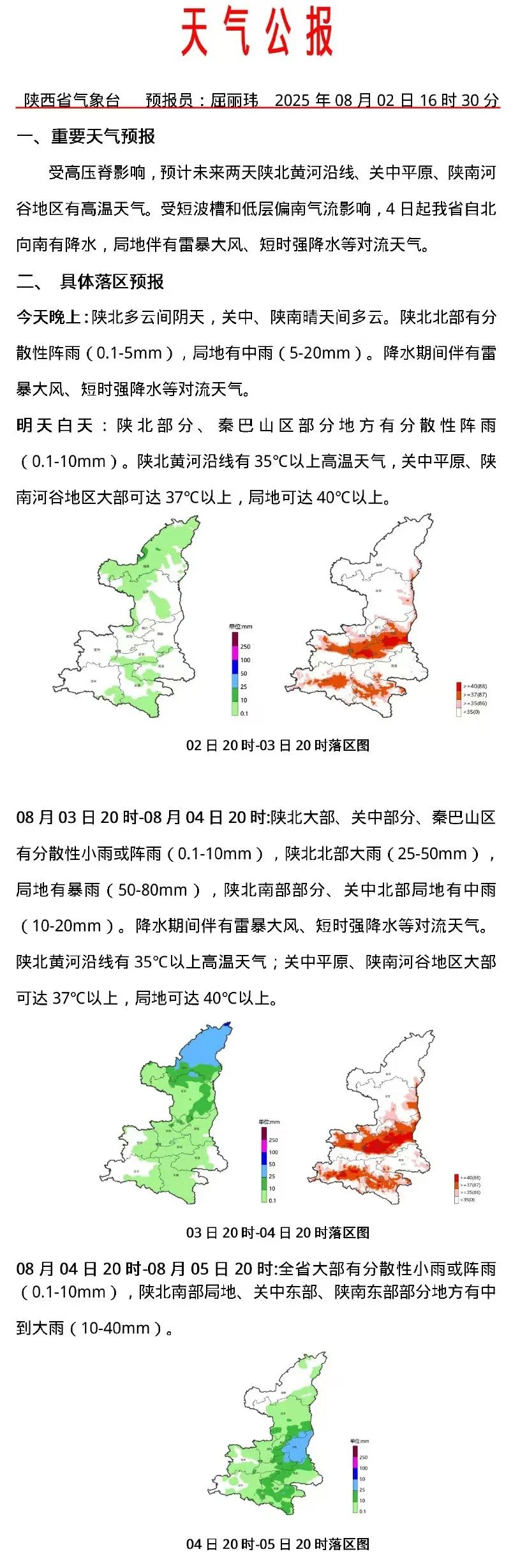 受高壓脊影響,預計未來兩天陝北黃河沿線、關中平原、陝南河谷地區有高温天氣。受短波槽和低層偏南氣流影響,4日起我省自北向南有降水,局地伴有雷暴大風、短時強降水等對流天氣。
