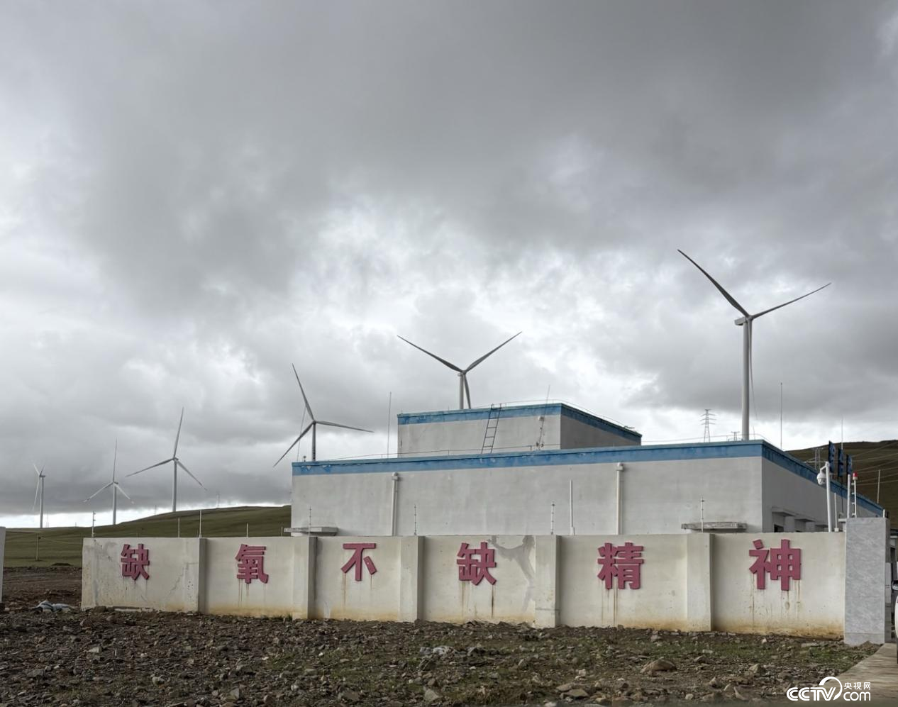 在哲古草原,巨大的風機葉片緩緩轉動,劃破長空。這裏是三峽措美哲古風電場——全球海拔最高的在運行風電場,牆上“缺氧不缺精神”的標語,正是技術突破與綠色發展的信念的最好寫照。