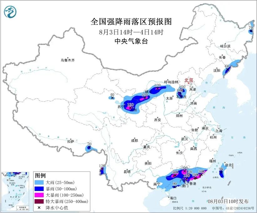 預計,8月3日14時至4日14時,黑龍江東北部、吉林東南部、遼寧東北部、青海東部、甘肅中部、陝西北部、寧夏北部、山西中北部、河北西部、廣西東部和南部、廣東、雲南西部、西藏東南部、台灣島等地部分地區有大到暴雨,其中,內蒙古河套地區、青海東部、甘肅中部、寧夏北部、河北西部、福建東南部、雲南西部、廣西東部、廣東北部和中東部等地部分地區有大暴雨,廣西東部、廣東西北部和東部沿海等地局地特大暴雨(250~320毫米)。上述部分地區伴有短時強降水(最大小時降雨量20~50毫米,局地可超過80毫米),局地有雷暴大風等強對流天氣。