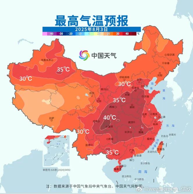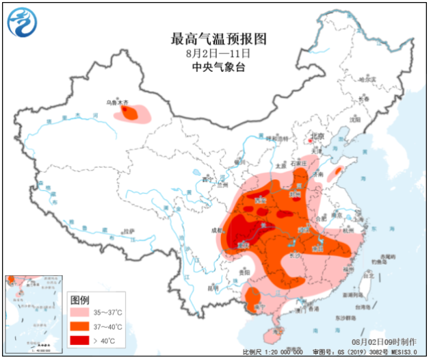 預計8月2日至11日,華北南部、黃淮、江漢、江淮西部、江南、華南、四川盆地及陝西、貴州東部等地將出現日最高氣温在35℃以上的高温天氣,其中陝西南部、四川東部、重慶、湖北西部等地的部分地區日最高氣温可達40~42℃ ,將接近或突破歷史極值。高温範圍最大、強度最強的時段在3日至5日。
