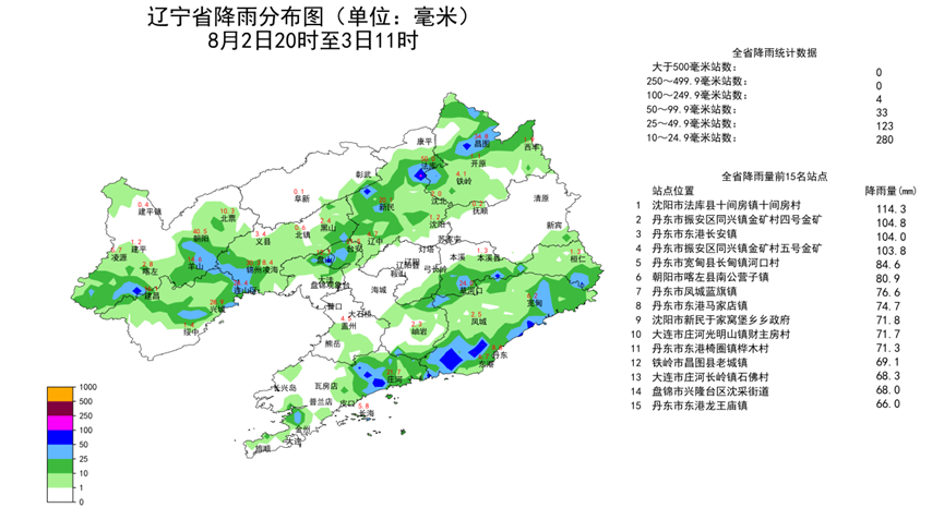 8月2日20時至3日11時遼寧省降雨分佈圖