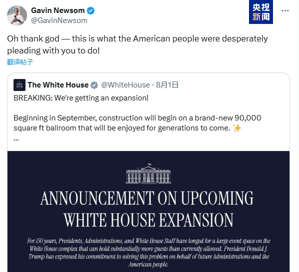 紐森團隊當天也發帖稱,特朗普及其政府*“更關心的是宴會廳,而非被他們剝奪了醫保的1700萬人”*。此前有分析稱特朗普政府推動的“大而美”税收與支出法案預計導致約1000萬美國人失去醫療保險。