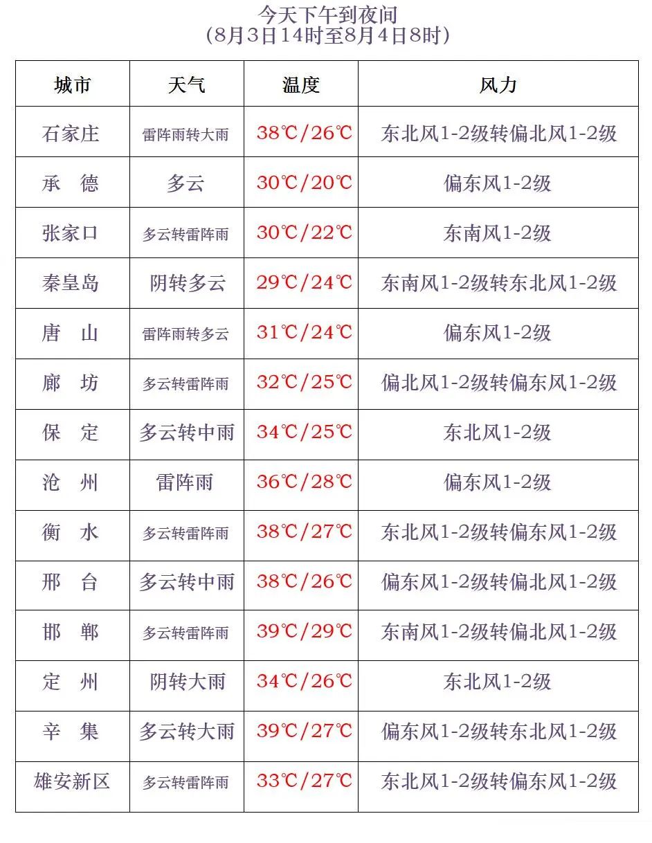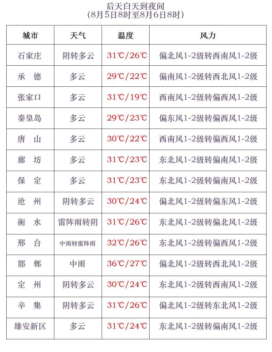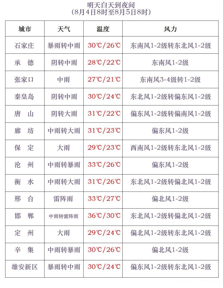 明天夜間到5日,全省陰,唐山南部、保定南部、雄安新區南部、廊坊大部、石家莊北部和東部、滄州、衡水、邢台東部有大雨到暴雨,局地有大暴雨,其他地區有小到中雨,降雨時局地伴有雷電、短時強降水、短時大風等強對流天氣。
