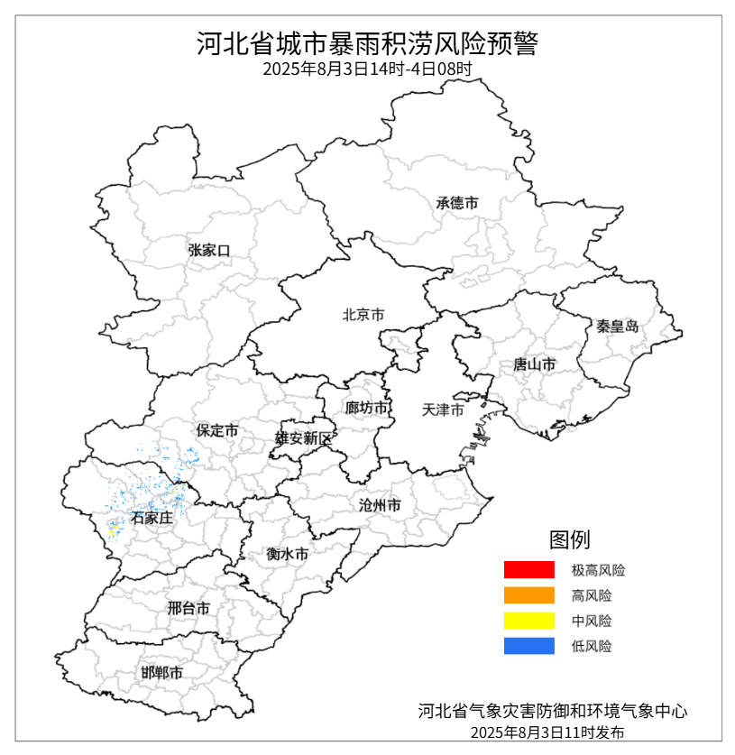 河北省氣象災害防禦和環境氣象中心8月3日11時發佈城市暴雨積澇風險預警: