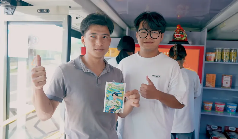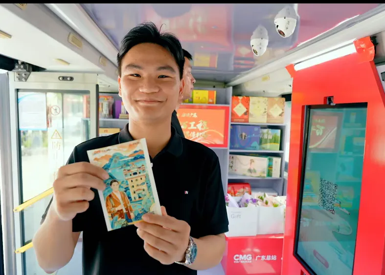 行進中,總枱大巴化身為廣東農特產品展示平台,搭建“百千萬工程”特色農產品展銷平台。此外,結合AI技術設計互動玩法,化身為移動的“時光照相館”。通過AI技術選擇奮鬥場景,拍攝個人定製“時光照片”,展現建設廣東“百千萬工程”的奮進姿態。