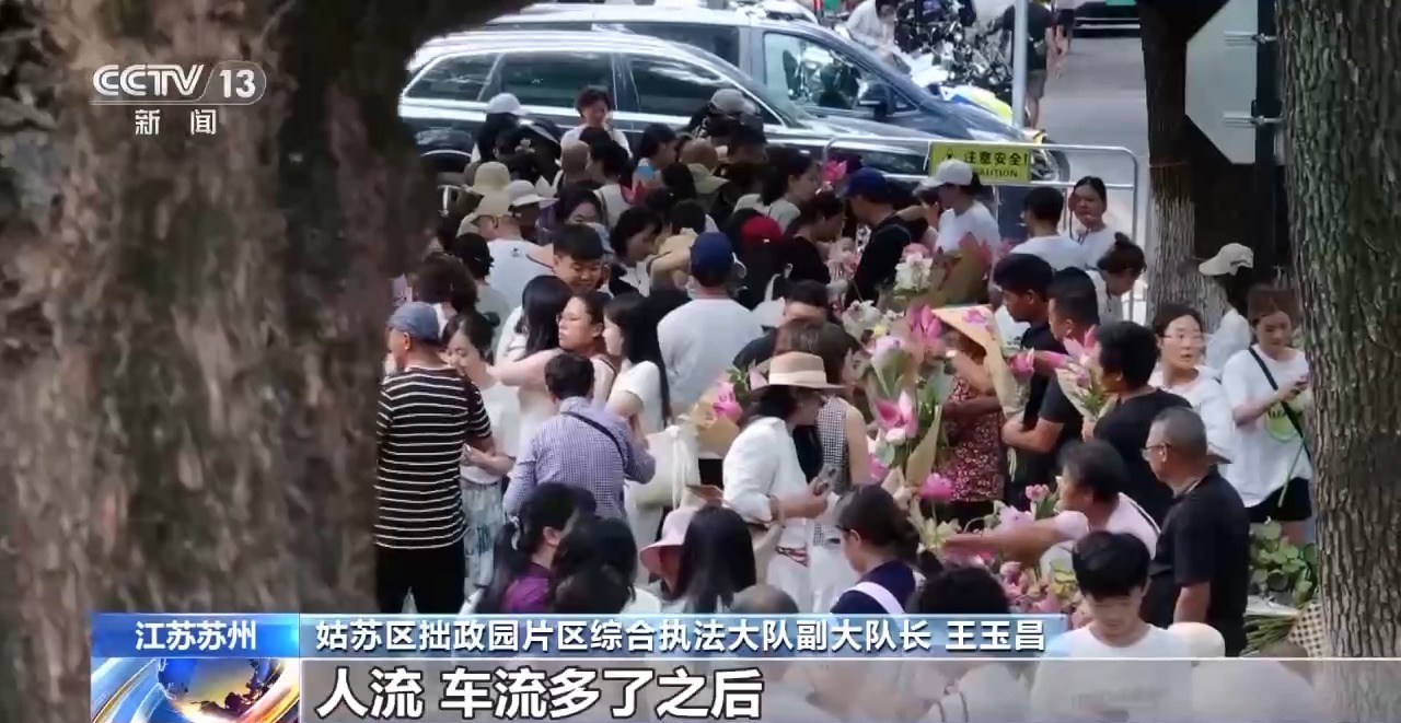 *姑蘇區拙政園片區綜合執法大隊副大隊長 王玉昌:*這個點位一天產生的垃圾量要趕上一個社區產生的垃圾量,人流、車流多了之後,交通的壓力也很大。為了讓這個點位從“網紅”到“長紅”,很多個部門都在參與這個事情,都在研究這個事情,爭取後期出台一個精細化的管理方案,讓這邊更加規範有序。