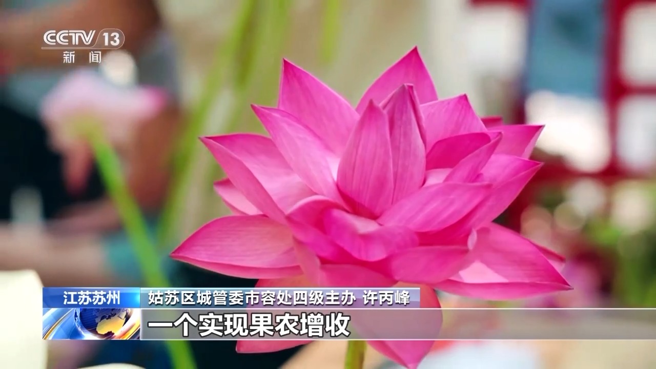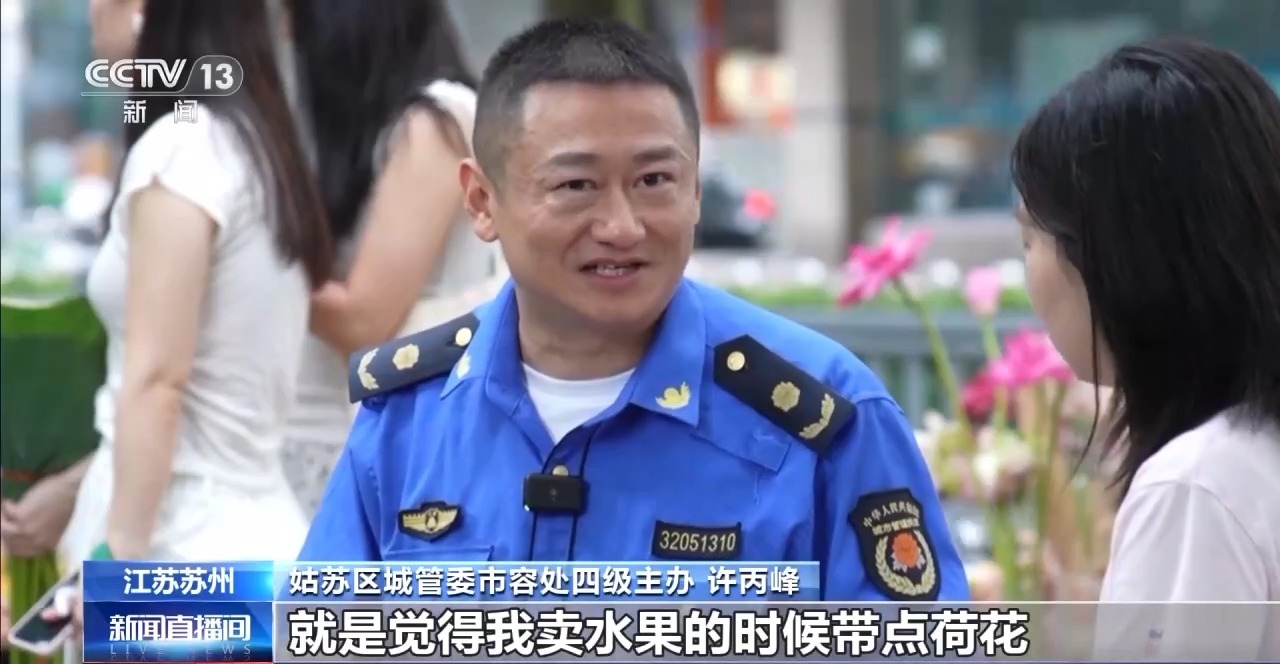 *姑蘇區城管委市容處四級主辦 許丙峯:*這個是他們自發形成的,就是覺得賣水果的時候帶點荷花,然後荷花有人買了,就賣得多了,賺到錢了,生意就越來越好。