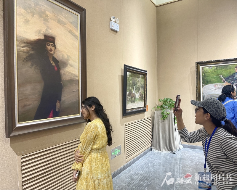 優雅嫵媚的俄羅斯族少女,青色草原深處的牧人之家,駕着驢車趕巴扎的幸福一家……油畫展廳裏,這些浪漫詩意的畫面定格在一幅幅油畫中,留學生們駐足觀賞、不時交流,在喜歡的作品前打卡拍照。