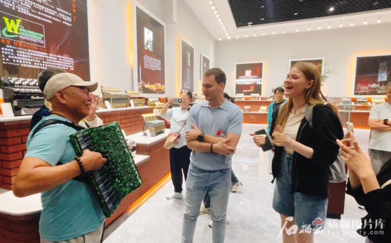 在塔城市民間手風琴藝人谷英福的伴奏下,留學生們聞聲起舞歡唱,《喀秋莎》《莫斯科郊外的晚上》《山楂樹》等一首首熟悉的旋律響起,前來參觀的遊客們也加入了大合唱,熱鬧的氛圍瞬間拉滿。“這裏多民族和睦相處,可以感受到音樂已成為大家交往交流交融的橋樑,呈現出了文化的豐富多樣性,這感覺很美妙。”來自俄羅斯的留學生妮拉有感而發。